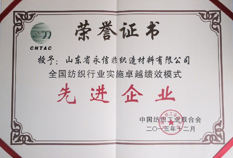 2016年1月20日,2015-2016年全國“質量紡織”大會在青島黃海飯店召開。首先,山東省紡織工業協會夏會長致開幕辭,中國紡織協會副會長高勇做了2015年紡織行業經濟運行情況和質量工作報告,姚穆院士對2016年紡織行業面臨的挑戰和機遇,及現行紡織質量形勢進行了分析,對紡織行業中一枝獨秀的產業用紡織品發現前景寄予了較高期望。接著,中國紡織聯合會做出了表彰決定,為十二家企業頒發了全國紡織行業質量獎,為十家企業頒發了紡織行業實施卓越績效模式先進企業獎,并頒發了2015年紡織行業質量杰出人物獎。山東省永信非織造材料有限公司獲得紡織行業實施卓越績效模式先進企業獎,公司董事長史成玉先生接受了證書和獎牌。