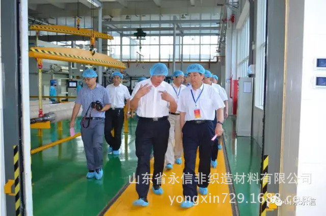 在公司新投產水刺五線生產現場,夏總向調研組一行領導介紹了水刺無紡布生產所用的原料、工藝流程、質量控制及市場發展,特別介紹了該條生產線的性能特點。