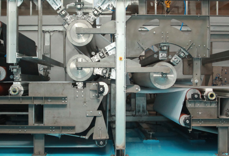 先進(jìn)的三圓鼓一平臺水刺工藝、科學(xué)穩(wěn)定的高壓供回水和水處理系統(tǒng)配置,不僅實(shí)現(xiàn)了產(chǎn)品品種的多樣性,而且實(shí)現(xiàn)了纖維根數(shù)無規(guī)律的有效纏結(jié),提高了強(qiáng)力,保證了產(chǎn)品后加工性能。