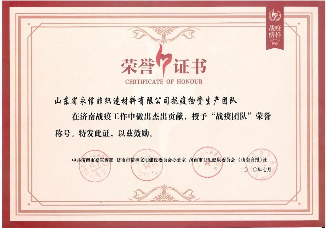 7月3日,由中共濟南市委宣傳部、濟南市精神文明建設委員會辦公室、濟南市衛生健康委員會、《山東商報》社聯合推出的“致敬英雄 點贊榜樣”2020濟南戰疫榜樣頒獎盛典舉行。濟南市委常委、宣傳部部長楊峰,濟南市委宣傳部、濟南市衛健委、魯商傳媒集團有關領導,章丘區委常委、宣傳部部長李寶燕參加活動并為獲獎者頒獎。山東省永信非織造材料有限公司榮獲“戰役團隊”稱號。
